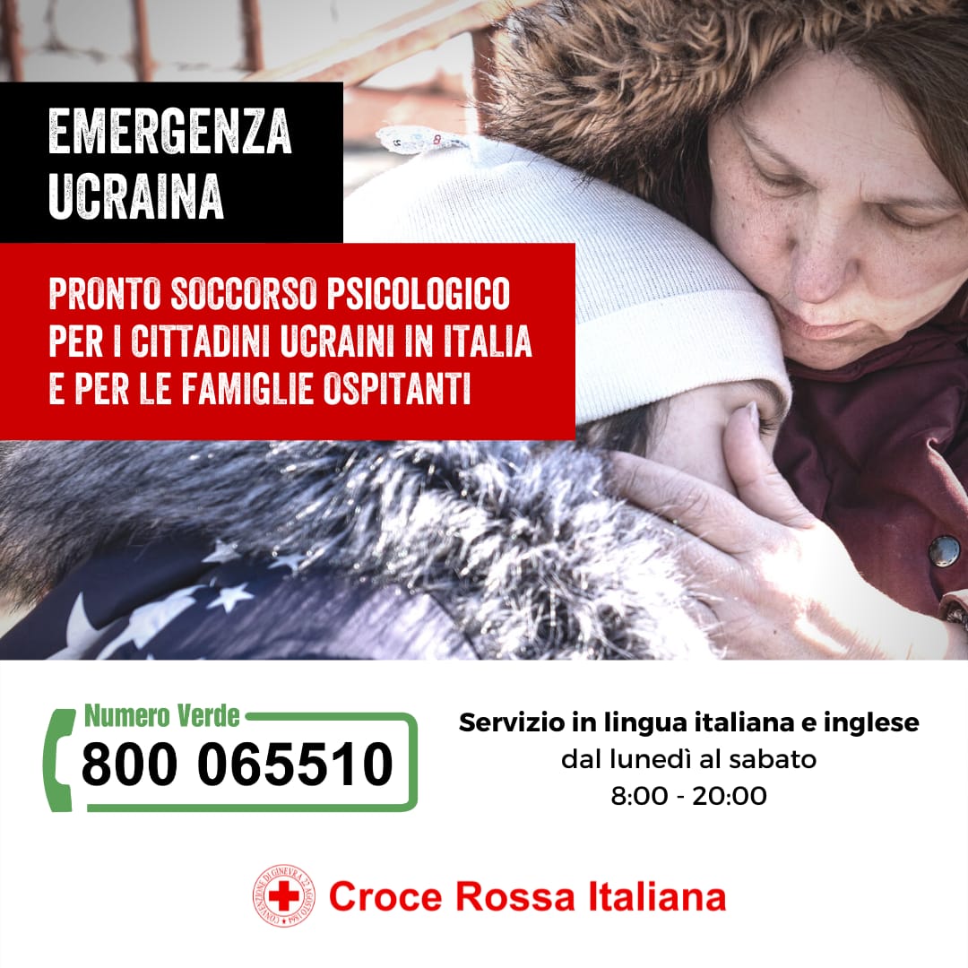 Si segnala che ANCI ha attivato con Croce Rossa Italiana CRI, una collaborazione per il supporto alla popolazione ucraina colpita dalla guerra in particolare per il sostegno pscologico. Cittadini ucraini e famiglie ospitanti dall'1 aprile potranno rivolgersi al seguente numero verde: 800065510. Servizio in lingua italiana e inglese dal lunedì al sabato ore 8.00 - 20.00.