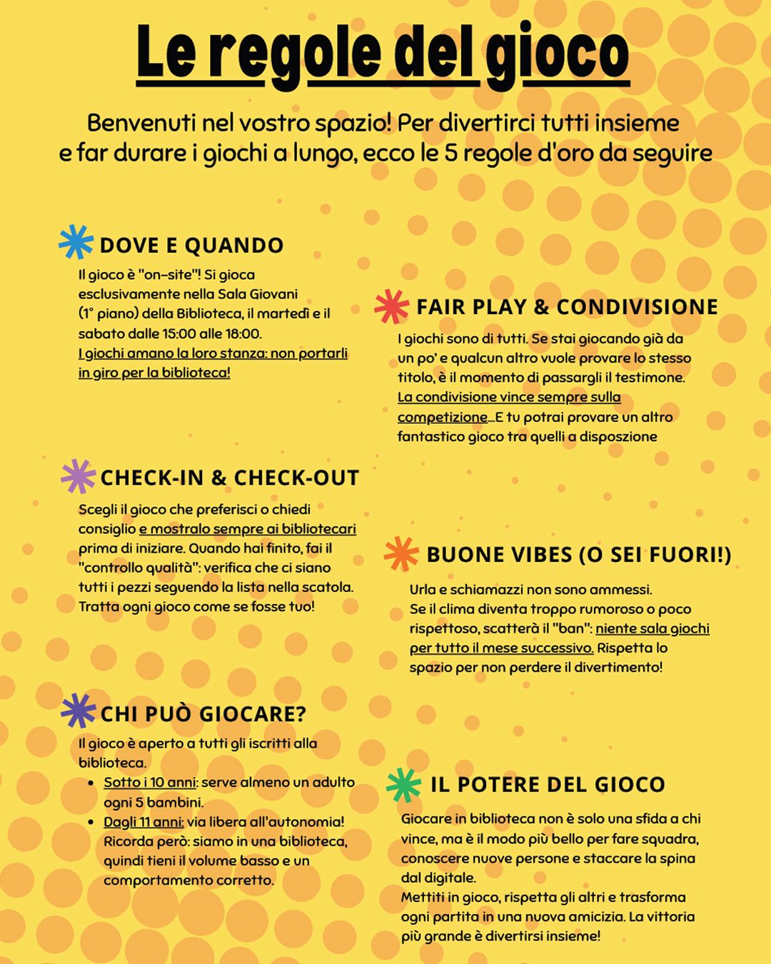 Per rendere lo spazio ludico al primo piano della biblioteca un ambiente accogliente e funzionale per tutti, il servizio si basa su una filosofia semplice ma rigorosa: regole e divertimento devono convivere, proprio come nei migliori giochi da tavolo. Il servizio sarà aperto a tutti gli iscritti alla biblioteca ogni martedì e sabato pomeriggio, dalle 15 alle 18.