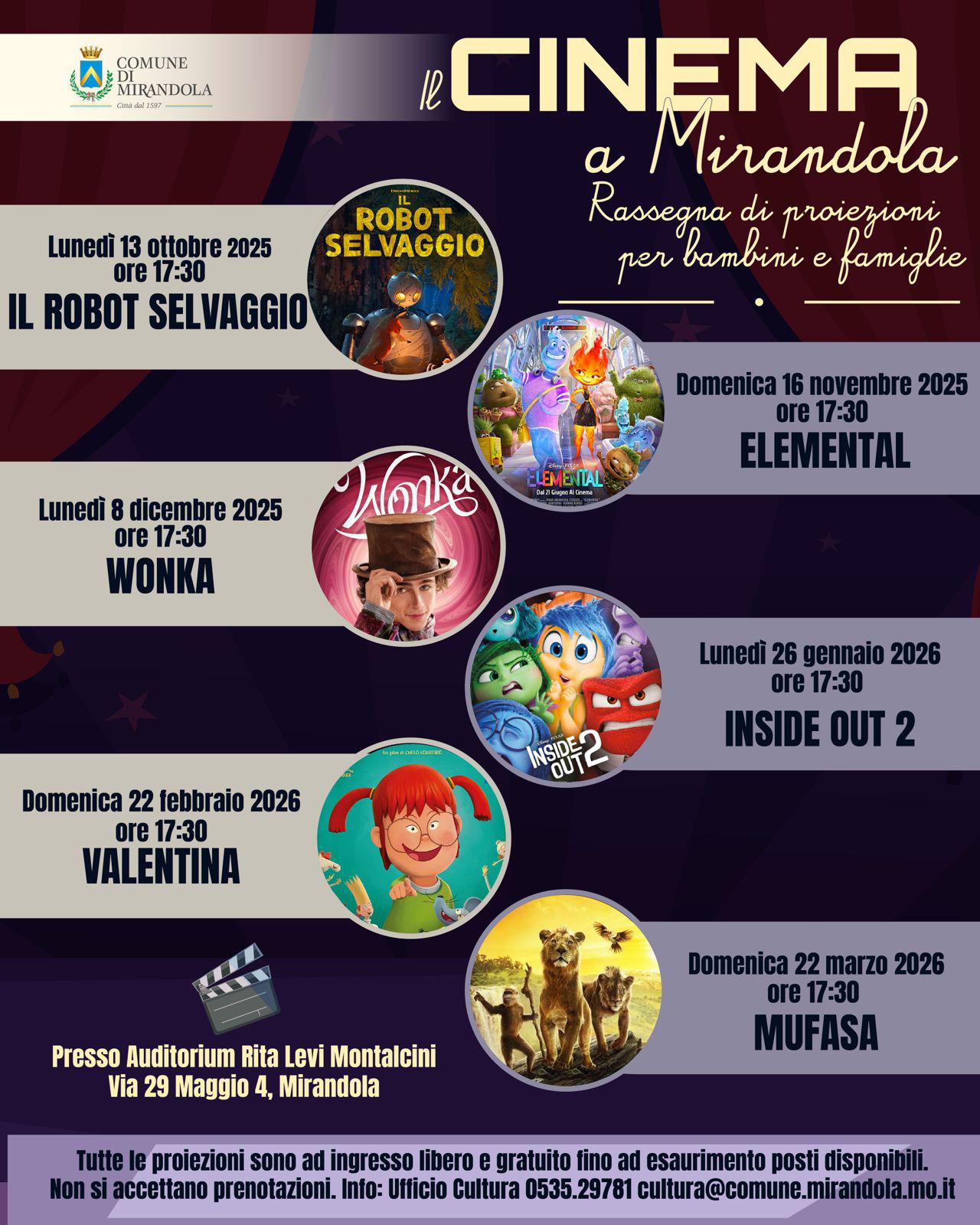 Dopo il grande entusiasmo raccolto nella stagione 2024/2025, l’Amministrazione comunale è felice di riportare sul grande schermo emozioni, risate e storie per tutti, con una nuova edizione della rassegna cinematografica pensata per le famiglie: “Il Cinema a Mirandola”.