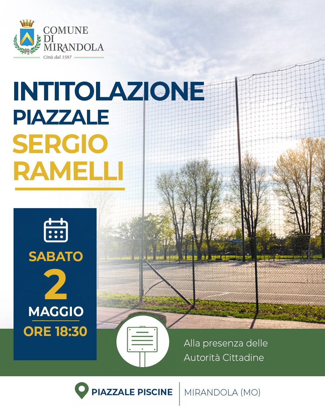 L’Amministrazione Comunale informa la cittadinanza che, nella giornata di Sabato 2 Maggio alle ore 18.30, alla presenza delle autorità, si terrà la cerimonia di intitolazione del piazzale antistante l’area delle piscine di Mirandola a Sergio Ramelli.