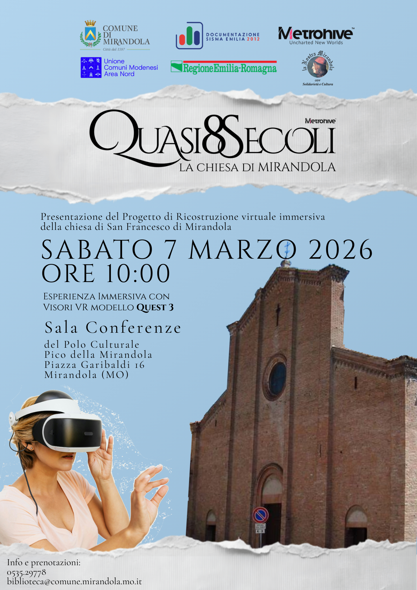 Ad aprire ufficialmente il calendario sarà, sabato 7 marzo 2026 alle ore 10., presso la Sala Conferenze del Polo Culturale “Il Pico” in Piazza Garibaldi 16, la presentazione del progetto “Quasi 8 secoli. La chiesa di Mirandola”, una ricostruzione virtuale in realtà aumentata che consentirà ai cittadini di immergersi, grazie a visori digitali, nell’antico splendore della chiesa. Il progetto, ideato e realizzato dall'azienda informatica Metrohive Studio di Francesco Dibartolomeo, è stato possibile grazie al contributo regionale del Centro Documentazione Sisma Emilia 2012. Le iscrizioni per provare l’esperienza sono aperte (0535.29778 – biblioteca@comune.mirandola.mo.it) con sessioni previste mattina e pomeriggio.