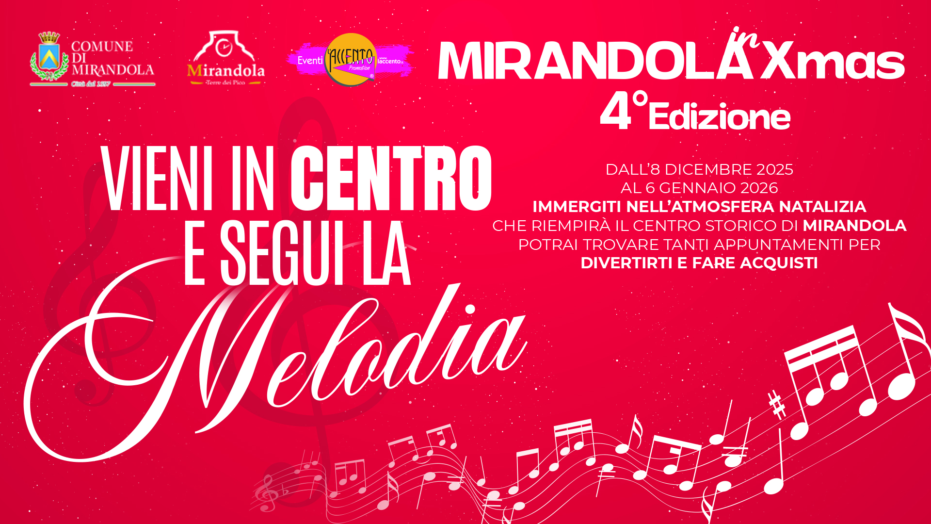 Il Comune di Mirandola rende noto il programma della quarta edizione di Mirandola XMAS, il programma di iniziative natalizie che fino al 6 Gennaio 2026 animerà il centro storico con un ricco calendario di appuntamenti, installazioni luminose, musica dal vivo e attività per famiglie.