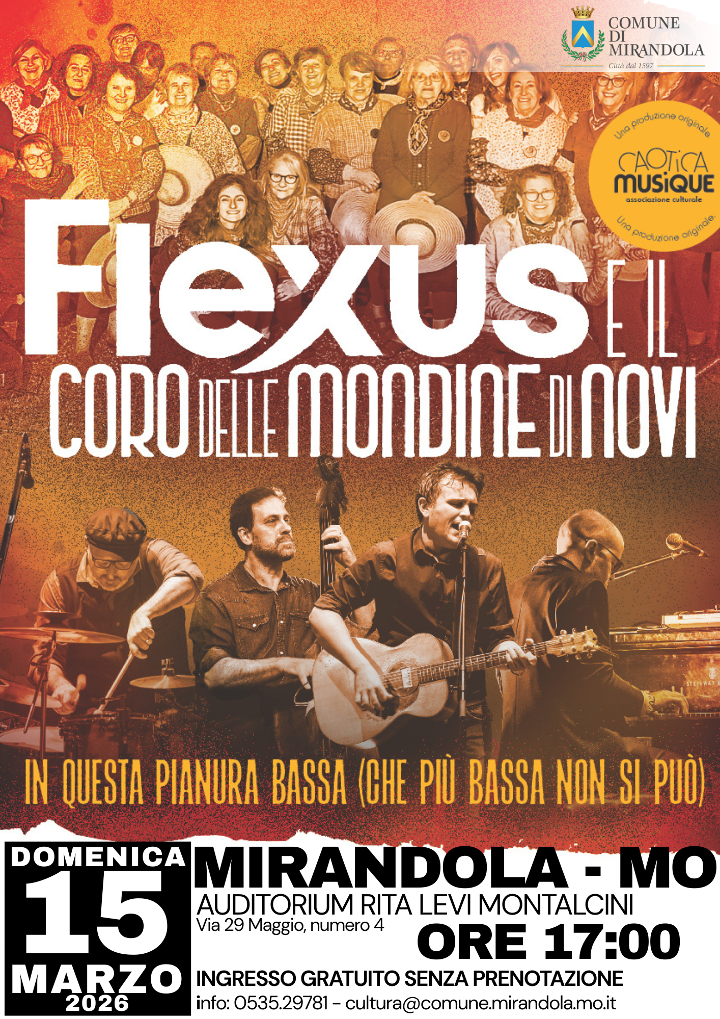 Sul palco la band Flexus, accompagnata dal Coro delle Mondine di Novi. Lo spettacolo porta in scena le canzoni storiche delle due formazioni, intrecciando i brani della tradizione della monda con quelli dei Flexus e con omaggi ai grandi cantautori italiani, tra cui Fabrizio De André.
