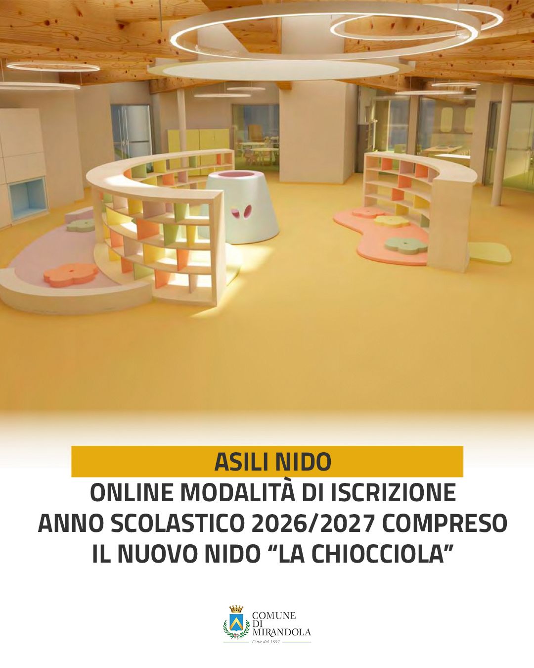 L’Amministrazione Comunale informa che sono aperte le iscrizioni ai nidi d’infanzia del Comune di Mirandola per l’anno educativo 2026/2027. Possono presentare domanda di iscrizione le famiglie dei bambini nati negli anni 2024 (grandi), 2025 (medi) e dei nati dal 1° gennaio 2026 (piccoli/lattanti), sia residenti, che non residenti nel Comune di Mirandola.