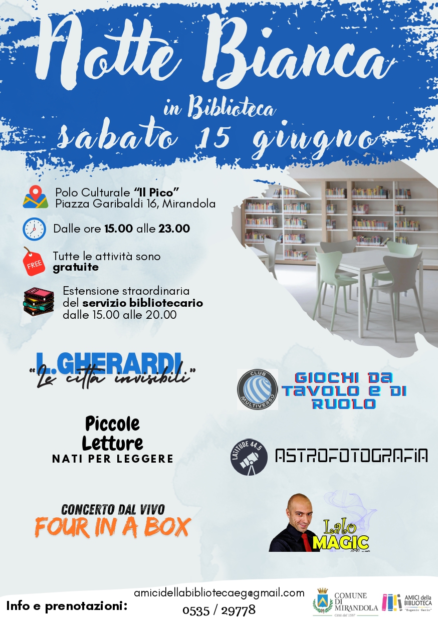 Sabato 15 giugno apertura straordinaria della biblioteca per la notte bianca: un pomeriggio e una serata ricchi di eventi per adulti e bambini organizzato dagli ‘Amici della biblioteca Eugenio Garin’.