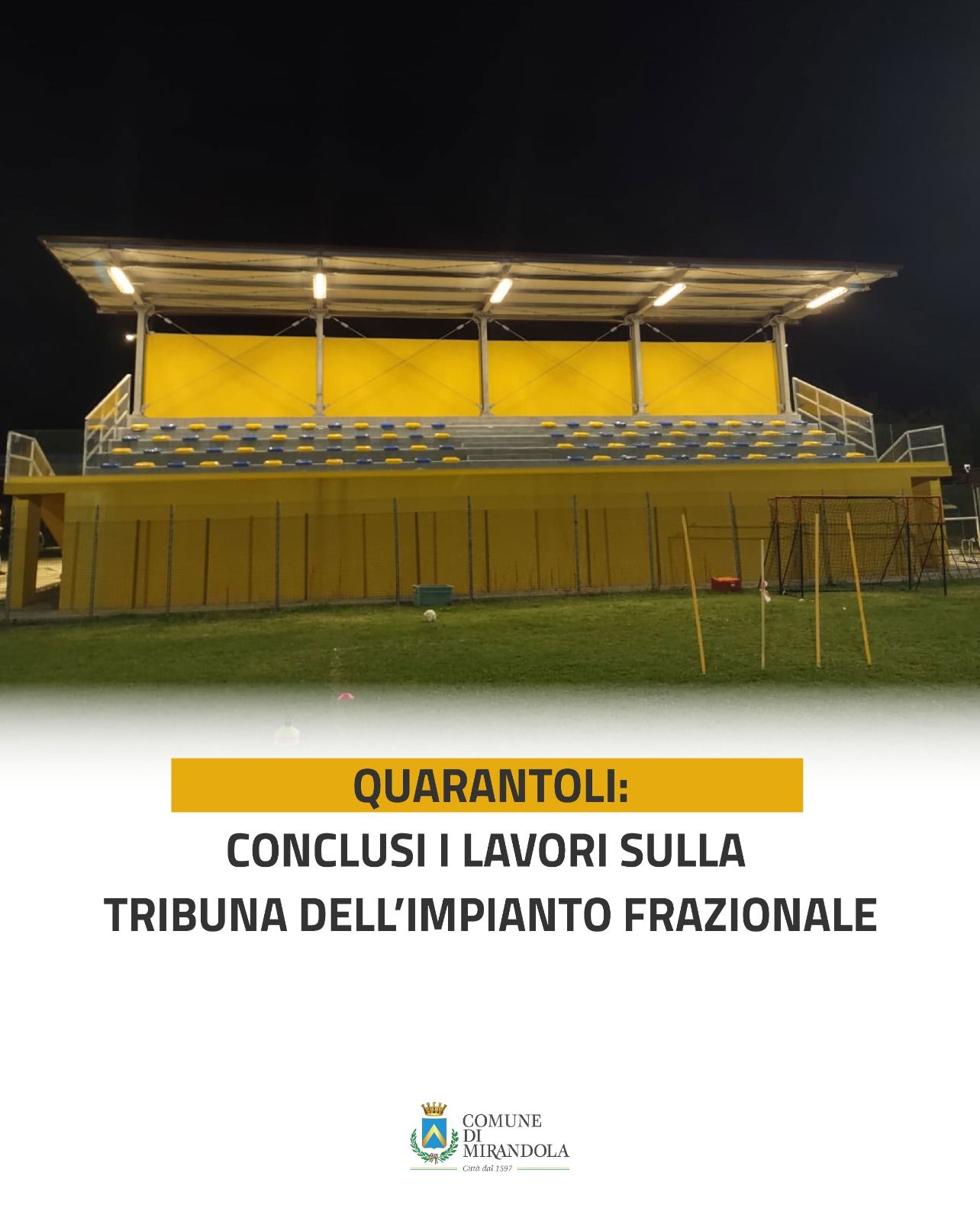 Si sono conclusi i lavori di realizzazione e riqualificazione della tribuna e del campo da gioco presso l’impianto sportivo in via S. Pertini 3, nella frazione di Quarantoli. Un intervento articolato, frutto di una programmazione pluriennale e di diversi stanziamenti, che ha permesso di restituire alla comunità una struttura rinnovata e funzionale. L’opera, finanziata complessivamente con risorse comunali per circa 350 mila euro, ha compreso: